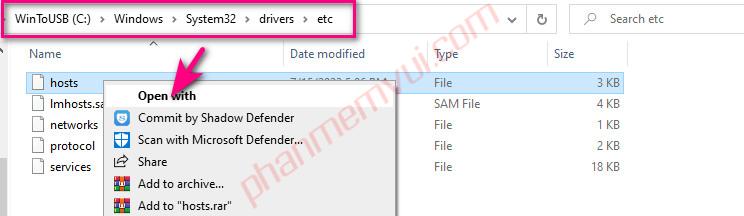 Đến thư mục C:\Windows\System32\drivers\etc > click chuột phải vào file hosts và chọn Open with