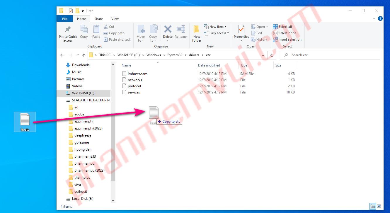 Kéo file hosts mới lưu vào thư mục như ảnh dưới