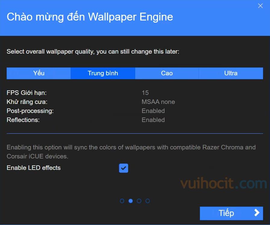 Chọn chất lượng cho hình nền của bạn. Bạn chất lượng yếu, trung bình, cao hoặc Ultra tùy vào cấu hình máy tính của bạn. Bạn có thể chọn Cao hoặc Trung Bình. Rồi bấm Tiếp.