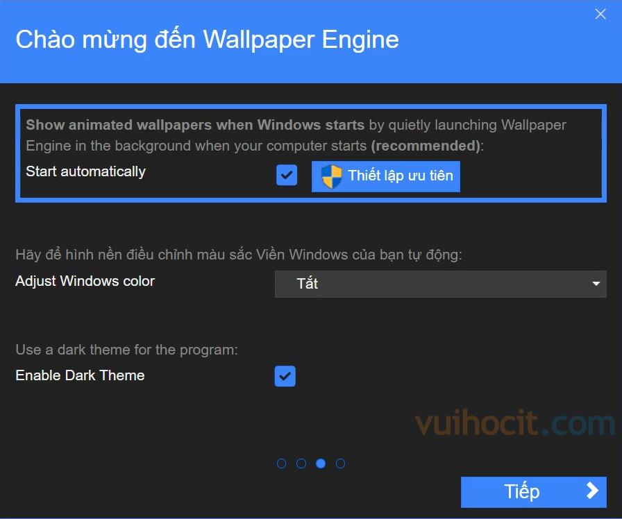 Ở cửa sổ bên dưới bạn tích vào ô Thiết lập ưu tiên nếu muốn khi khởi động máy tính vẫn giữ hình nền động thì tích vào ô đó nhé.