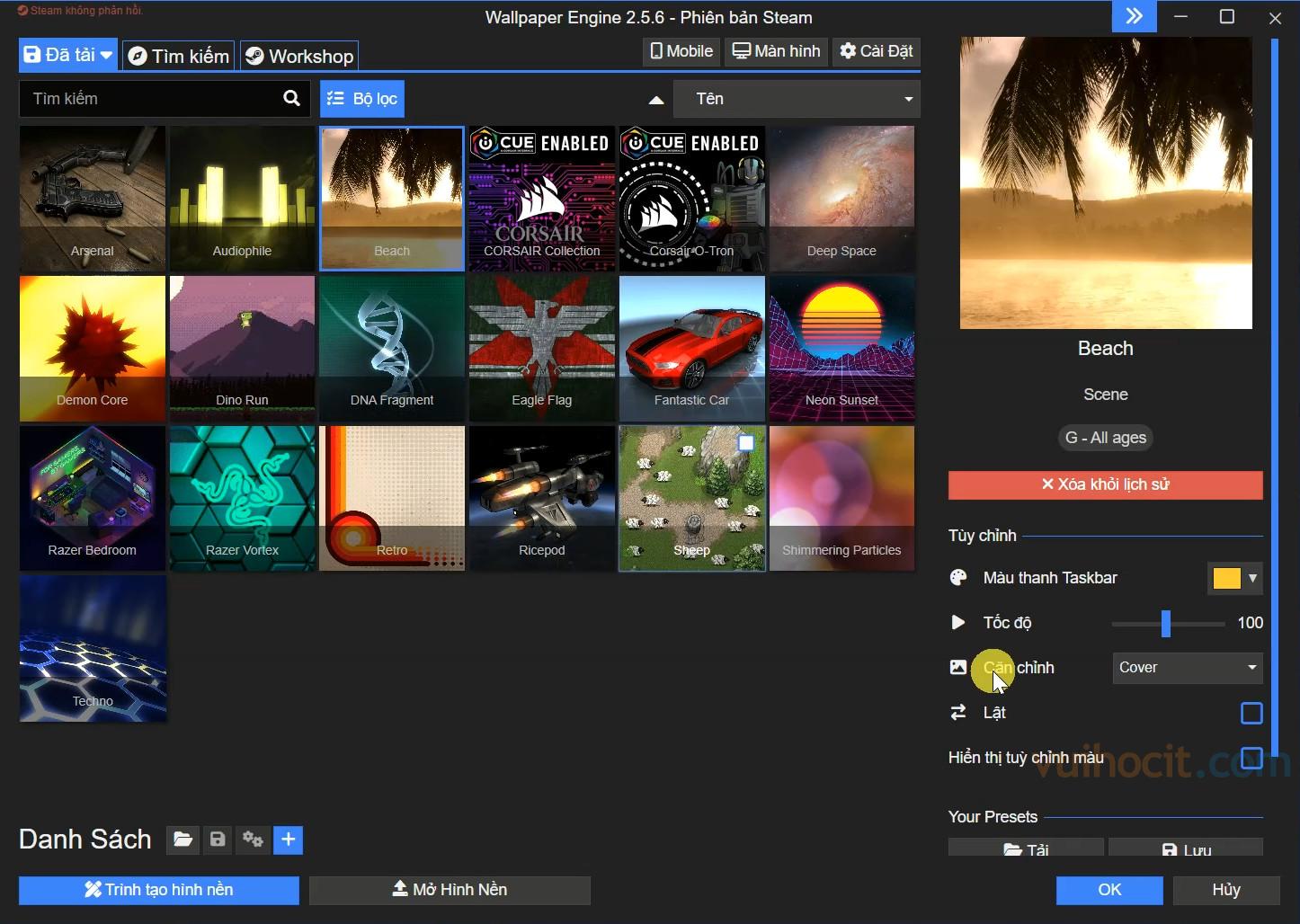 Dưới đây là giao diện của Wallpaper Engine Full Crack. Để đổi một hình nền nào đó, bạn hãy chọn hình nền đó và chọn nút OK.