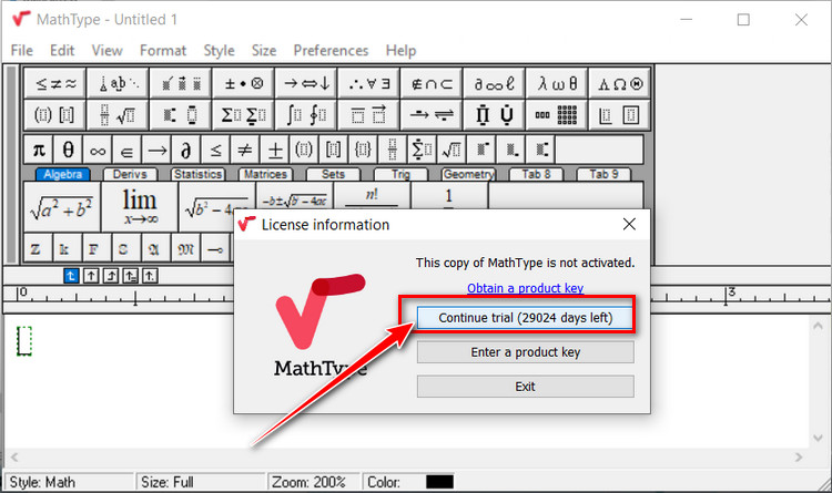 Bạn mở phần mềm MathType lên sẽ có thông báo Continue trial(29204 days left) tức bằng khoản 80 năm sử dụng.